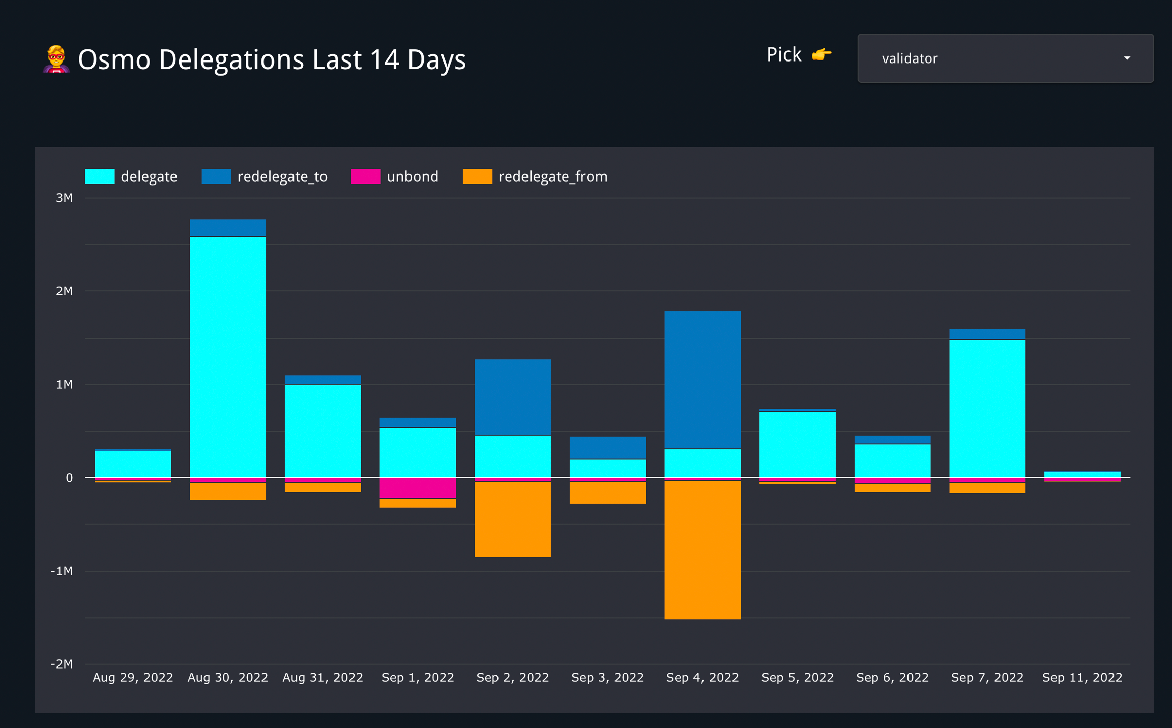 The Osmosis Staking and Delegation Activity Chart visualizes user interactions with staking and delegation features within the Osmosis ecosystem. It provides insights into how users engage with validators, re-delegate their tokens, and participate in staking activities, helping you better understand user behavior and trends.